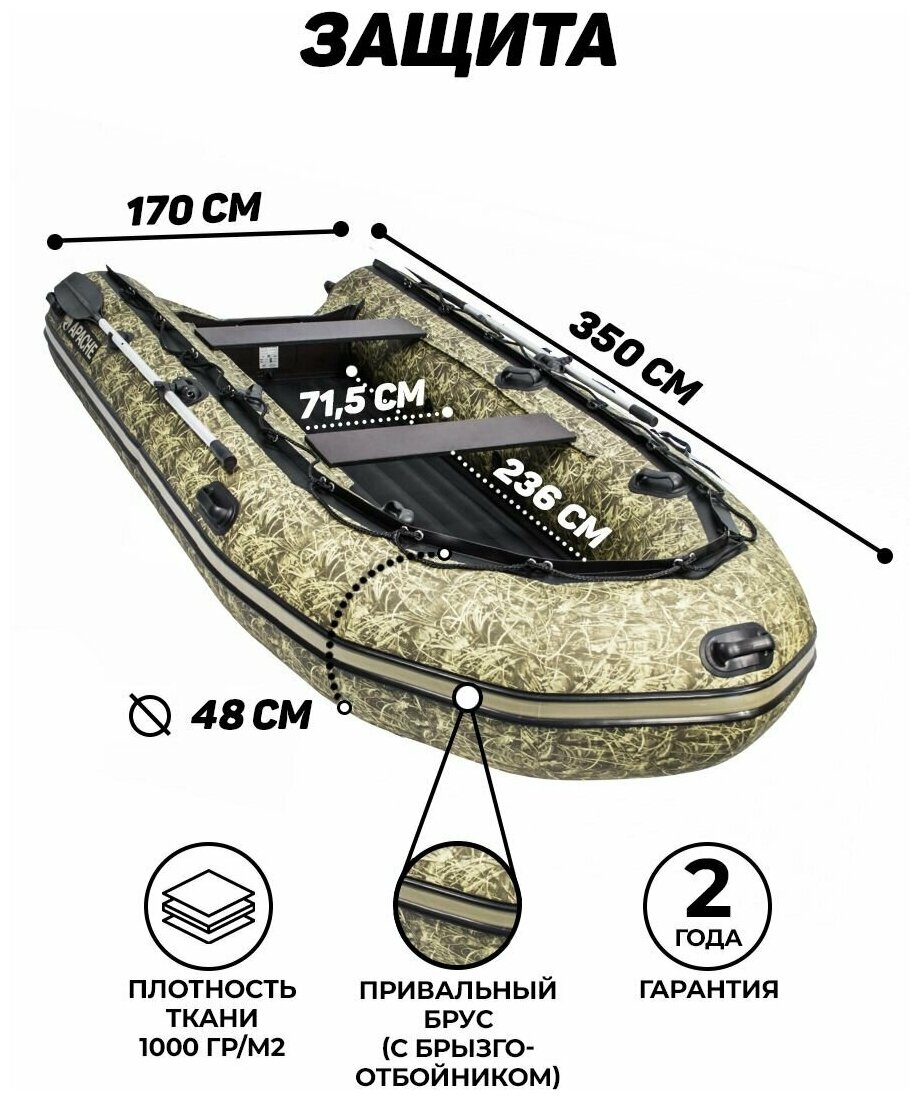Type: motorized, number of seats: 4, bottom type: inflatable, boat material: reinforced PVC, load capacity: 550 kg, boat length: 350 cm, boat width: 170 cm, weight: 45 kg, maximum motor power: 15 hp ., transom: built-in