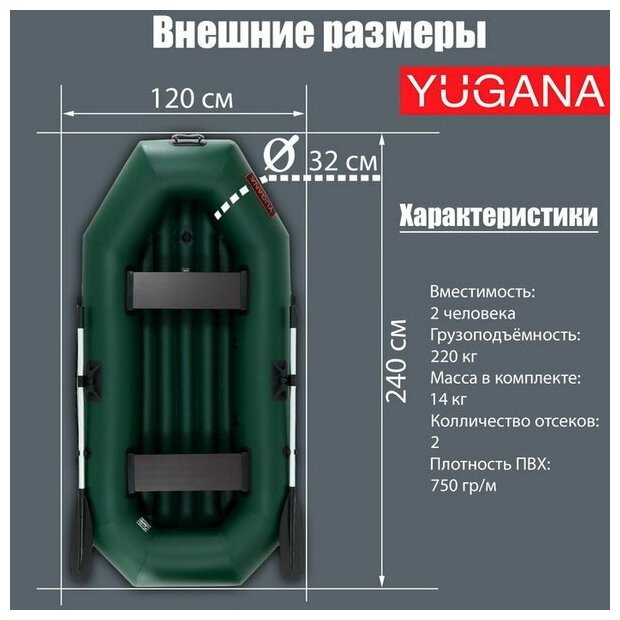 Type: rowing, number of seats: 2, bottom type: non-inflatable, load capacity: 220 kg, boat length: 240 cm, boat width: 120 cm, weight: 13 kg, transom: no