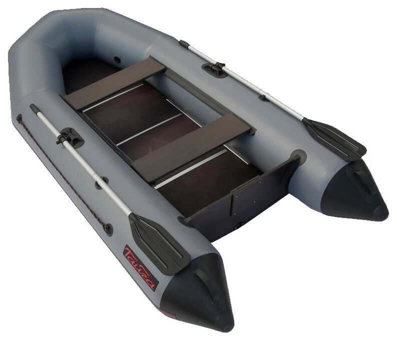 Detachable aluminum oars 160 cm 2 pcs., plywood bank seat on sliding fasteners 2 pcs., solid plywood flooring with aluminum n-profile, side aluminum stringers 2 pcs., pump-pump 5 l, repair kit, transport package