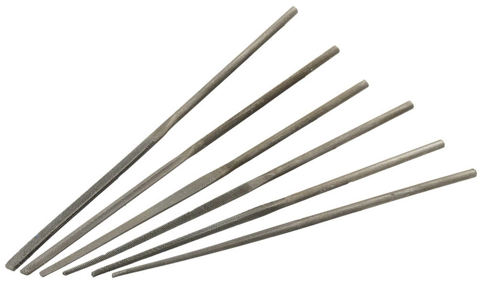 The shape of the working part of the needle files in the set: flat, round, semicircular, triangular, square, flat with a pointed end; bar diameter: 3 mm