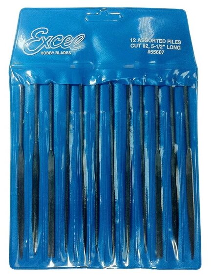 2 flat, 2 round, 2 triangular, 2 square, 2 knife, 2 semicircular needle files, vinyl sleeve