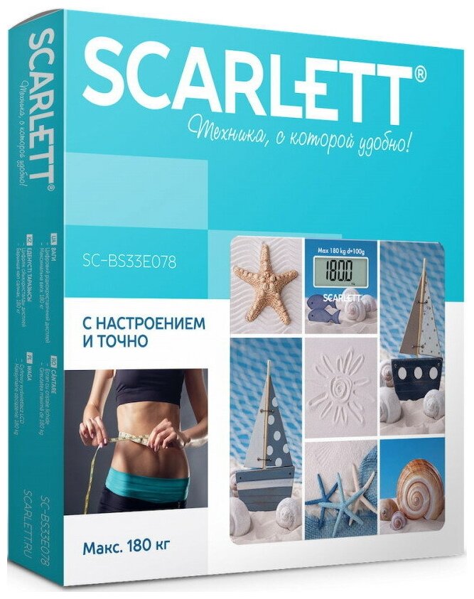 Device type: scales, scale type: electronic, additional functions: battery charge indicator, maximum load: 180 kg, battery type: CR2032, measurement accuracy: 100 g, platform material: plastic, glass