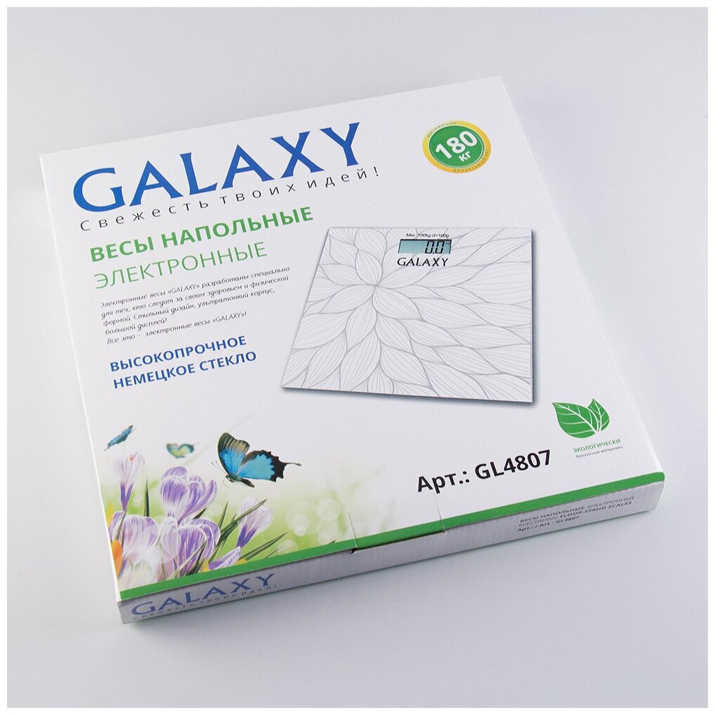 Device type: scale, scale type: electronic, additional functions: not applicable, Smart Home Ecosystem: no, maximum load: 180 kg, battery type: CR2032, measurement accuracy: 100 g, platform material: glass