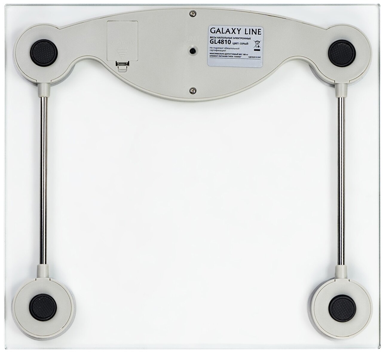 Device type: scale, scale type: electronic, additional functions: not applicable, Smart Home Ecosystem: no, maximum load: 180 kg, battery type: CR2032, measurement accuracy: 100 g, platform material: glass