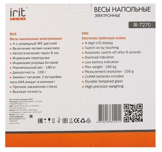 Device type: scales, scale type: electronic, maximum load: 180 kg, battery type: AAA, platform material: plastic, glass