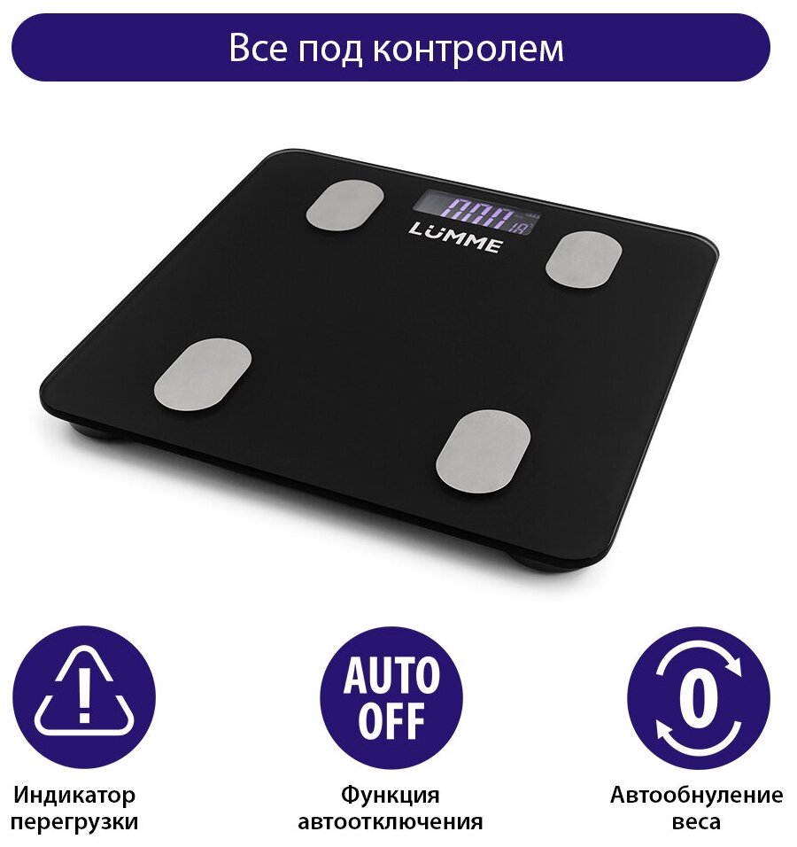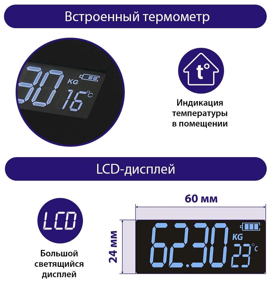 Device type: scales, type of scales: electronic, additional functions: air temperature measurement, determination of the proportion of water, determination of the proportion of adipose tissue, determination of the proportion of bone tissue, determination