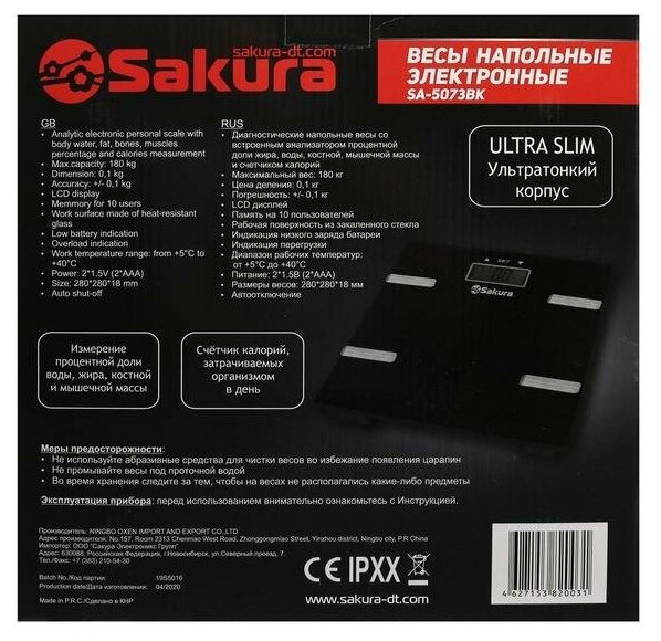 Device type: scales, type of scales: electronic, additional functions: determination of the proportion of water, determination of the proportion of adipose tissue, determination of the proportion of bone tissue, determination of the proportion of muscle t