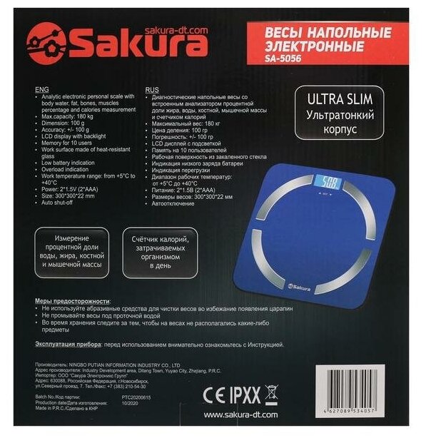 Description: Device type: scales, type of scales: electronic, additional functions: determination of the proportion of bone tissue, memory, calculation of BMI BMI, diagnostic, maximum load: 180 kg, battery type: AAA, measurement accuracy: 100