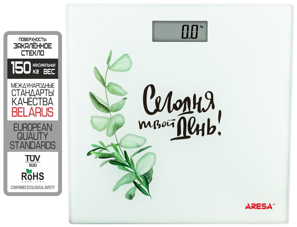 Device type: scales, scale type: electronic, maximum load: 150 kg, battery type: CR2032, measurement accuracy: 100 g, platform material: glass