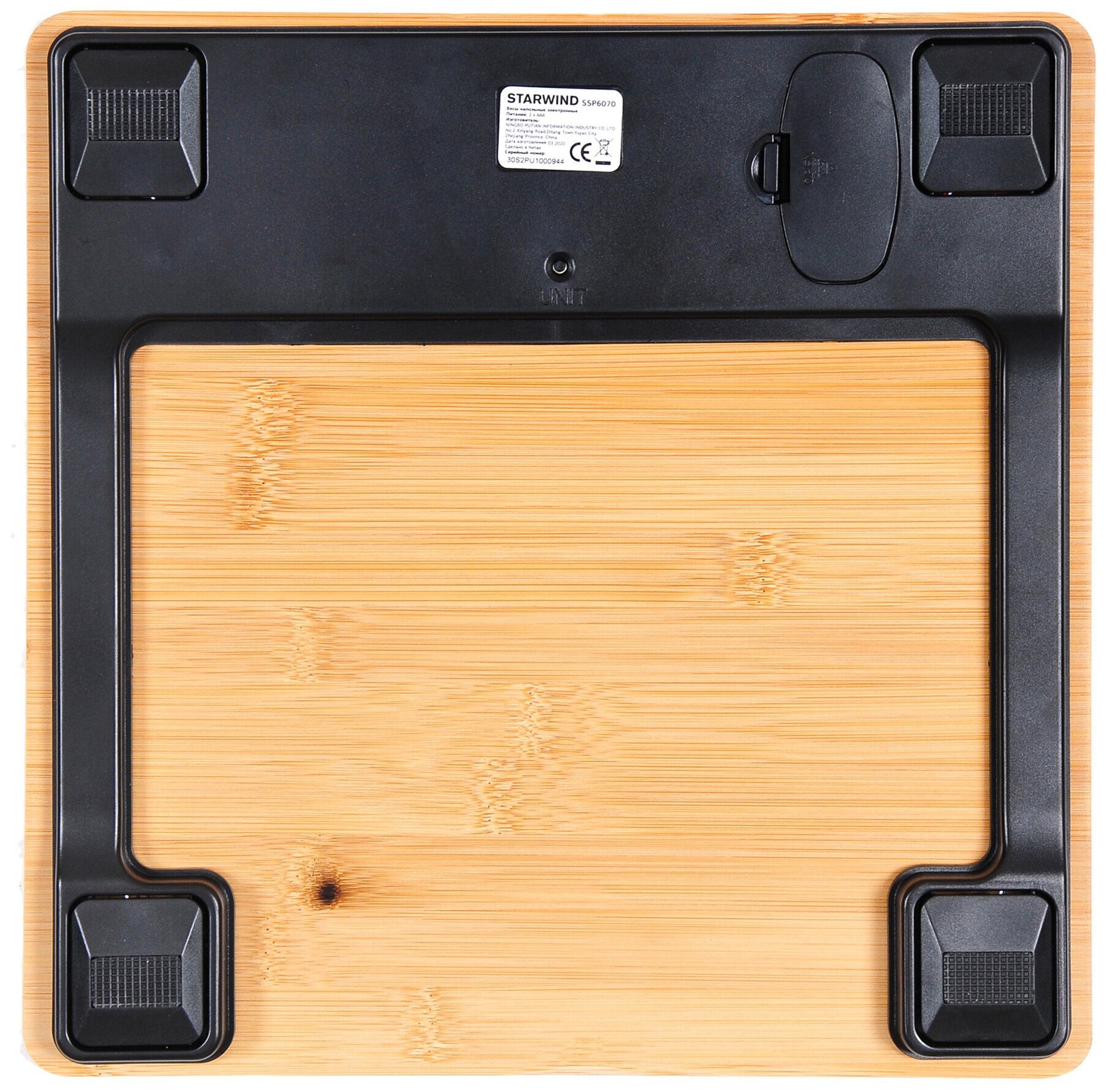Device type: scales, scale type: electronic, maximum load: 180 kg, battery type: AAA, measurement accuracy: 100 g, platform material: bamboo, wood