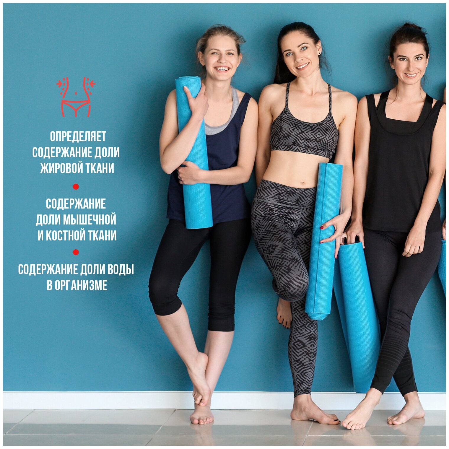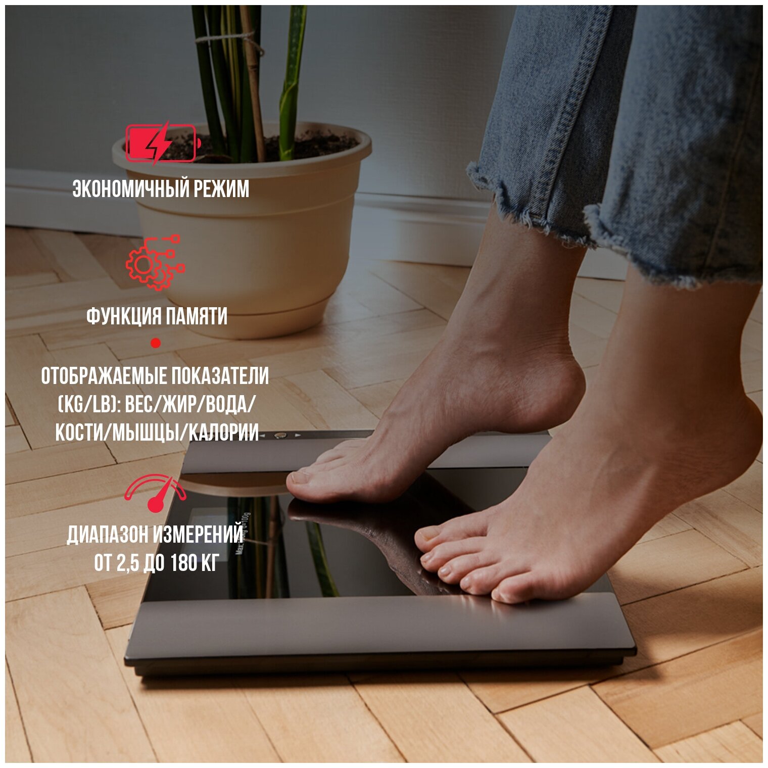 Device type: scales, type of scales: electronic, additional functions: determination of the proportion of water, determination of the proportion of adipose tissue, determination of the proportion of muscle tissue, diagnostic, maximum load: 180 kg, type of