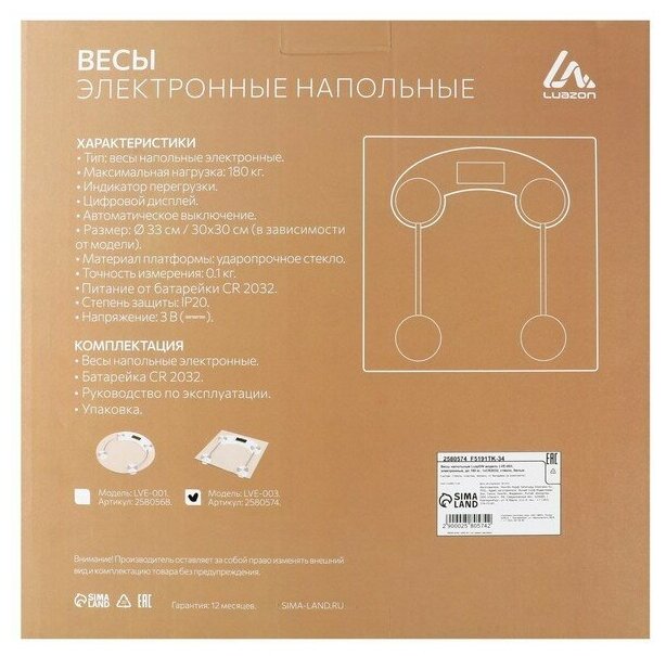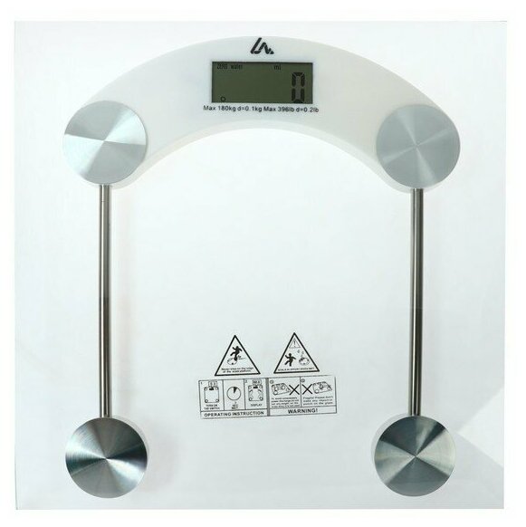 Device type: scales, scale type: electronic, maximum load: 180 kg, battery type: CR2032, measurement accuracy: 100 g, platform material: glass