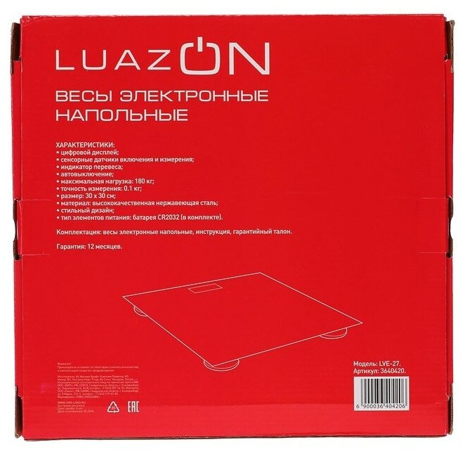 Device type: scales, scale type: electronic, maximum load: 180 kg, battery type: CR2032, measurement accuracy: 100 g, platform material: metal
