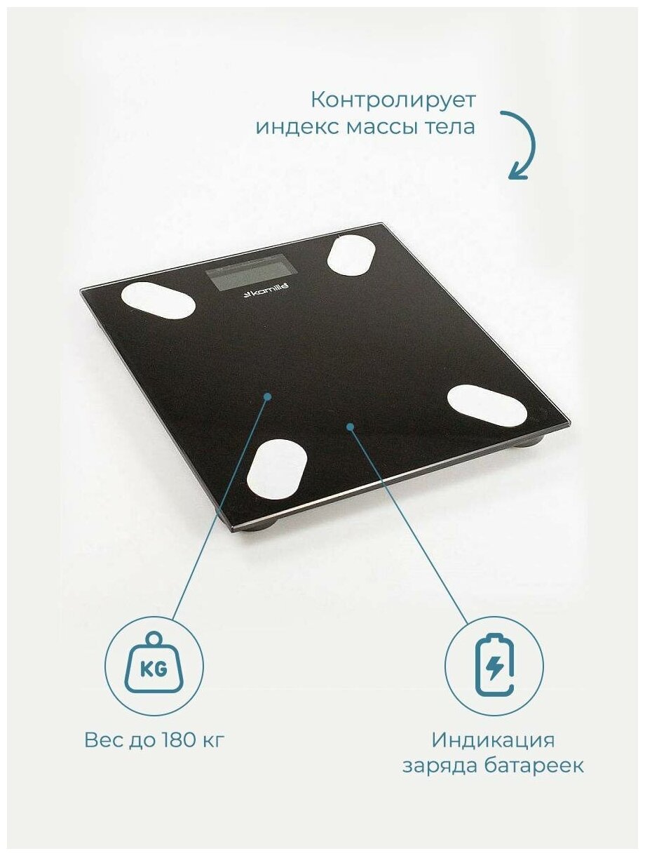 Device type: scales, type of scales: electronic, additional functions: air temperature measurement, determination of the proportion of water, determination of the proportion of adipose tissue, determination of the proportion of bone tissue, determination