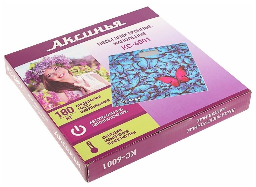 Device type: scales, scale type: electronic, additional functions: automatic switch-off, maximum load: 180 kg, battery type: AAA, measurement accuracy: 100 g, platform material: glass