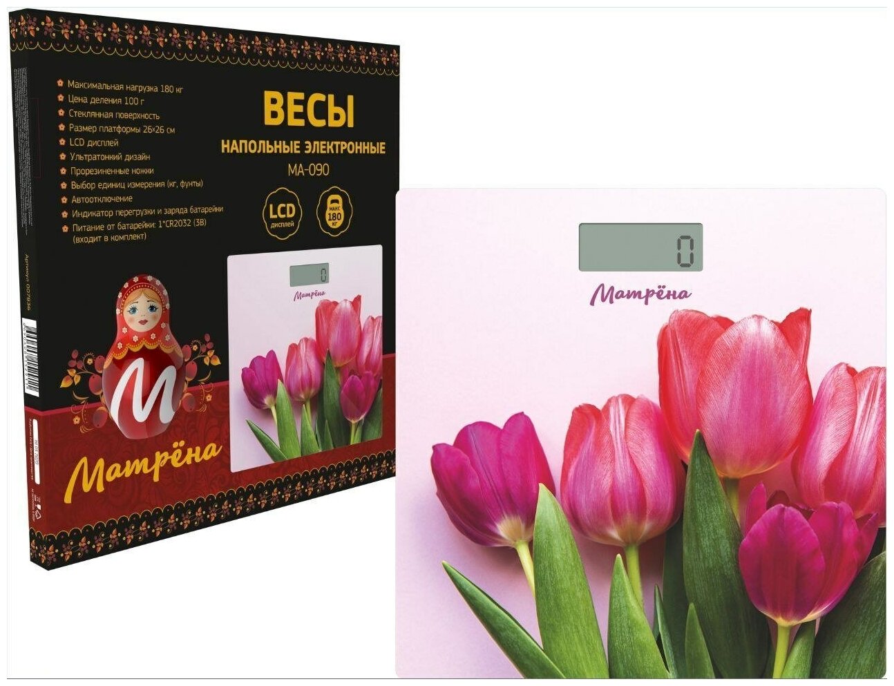 Device type: scales, scale type: electronic, maximum load: 180 kg, battery type: CR2032, platform material: glass