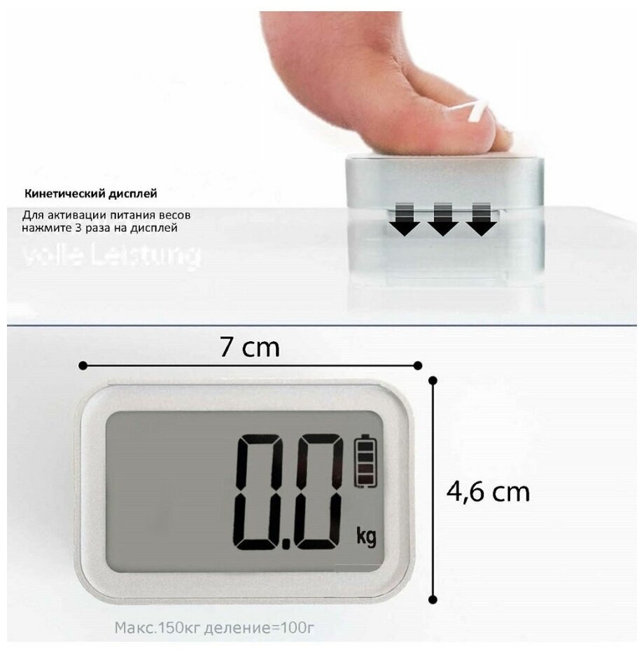 Device type: scales, scale type: electronic, electronic floor scales, maximum load: 150 kg, battery type: without batteries, measurement accuracy: 100 g, platform material: glass, glass, plastic