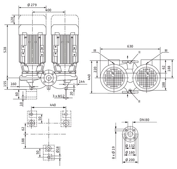 Enclosure with support legs for foundation mounting, consoles on request; II opening for pressure measurement R1/8; III venting R1/8