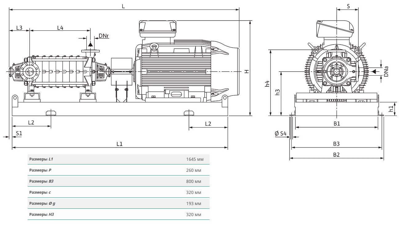 Installation dimensions: branch pipe for suction. side DNs - DN 65; pressure pipe side DNd - DN 50; number of impellers: 8; scope of delivery: pump unit for horizontal installation, including electric motor, couplings