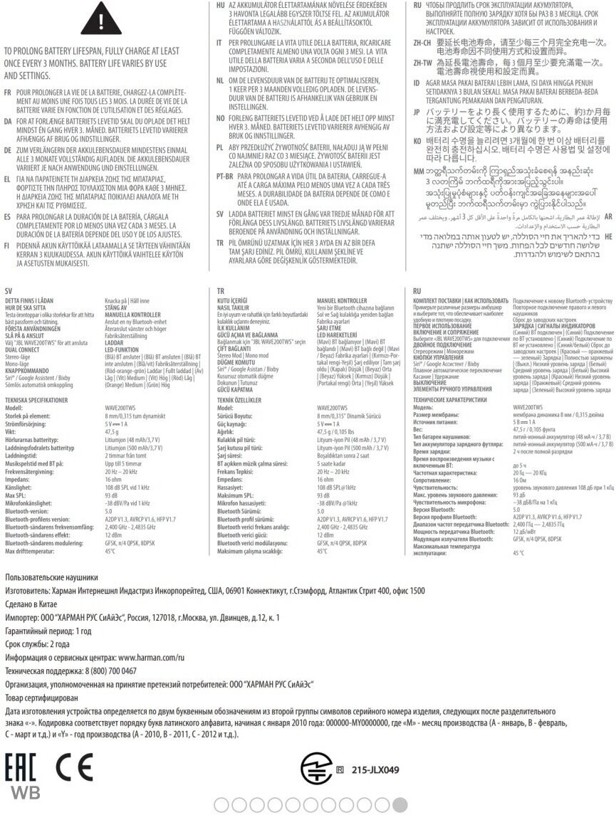 Equipment: Pair of JBL Wave 200TWS headphones, charging case, USB-C charging cable, 3 pairs of ear tips in different sizes, warranty/warning card, quick start guide/safety data sheet