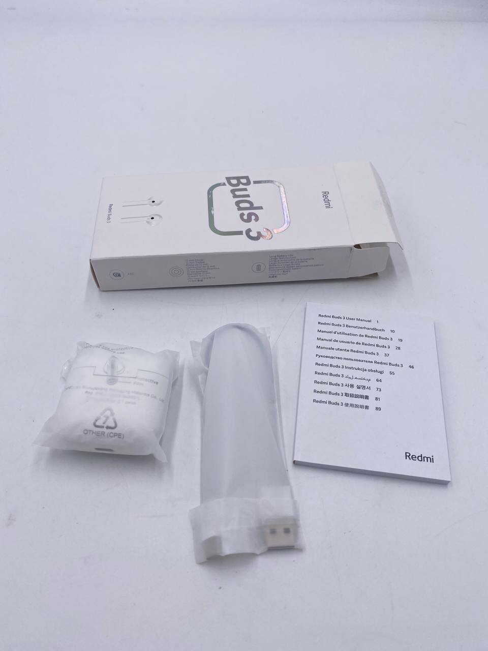 Redmi Buds 3; charging case; charging cable; manual; warranty card