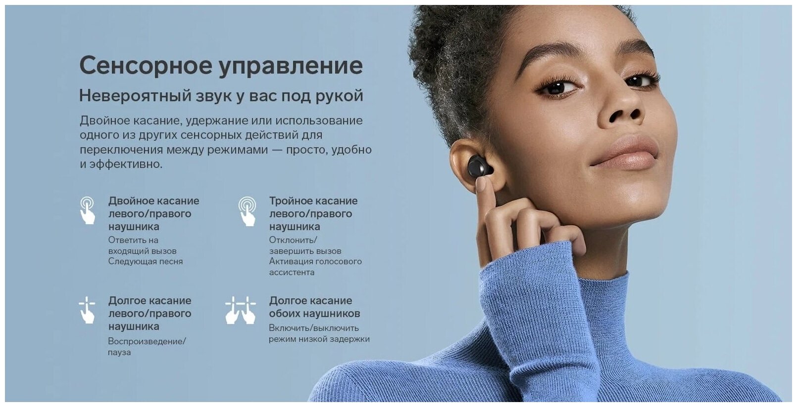 Passive noise cancellation; touch control; Game Mode; earpiece dimensions: 24.5 x 16.7 x 24.6 mm; connection distance: 10 m open space without obstacles; supported codecs depending on the version: Global - SBC