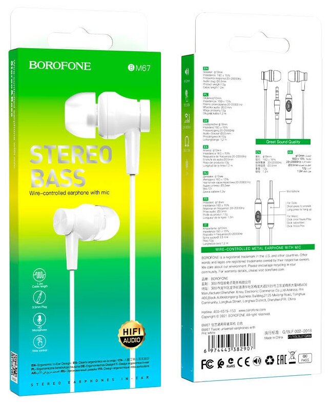 Design: earbuds, device type: wired headphones, design features: moisture protection, microphone, functions: surround sound, volume control