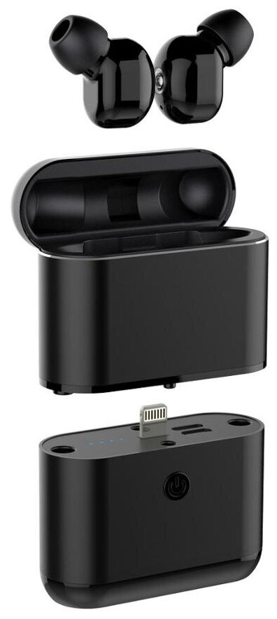 IPX5; built-in Powerbank Lightning connector; case: 55*80*24 mm, 1600 mAh; the ability to use one earpiece; Range: 10 m; Case included: yes; iPhone support: yes; LED indicator: yes; Automatic pair connection