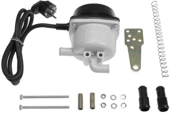 Type of vehicles: cars, trucks, type: engine heater, type of heater: electric, type of heating: liquid, presence of thermostat, supply voltage: 220 V, control: mechanical