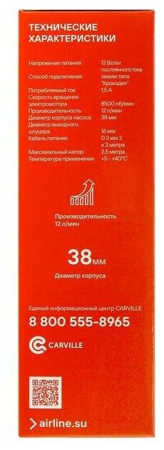Additional Information: Productivity: 12 l/min; supply voltage: 12V; operation is allowed in a wide temperature range of the environment from 5 to 40 degrees; diameter 38 mm