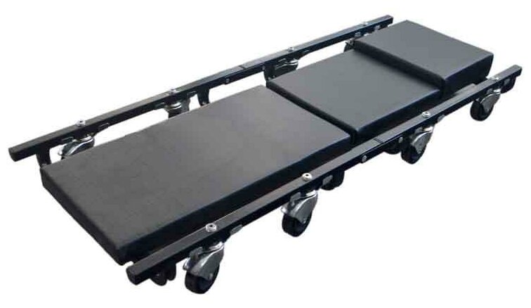 Type: repair bed on wheels, roll under the bottom, features: wheels for moving, folding design