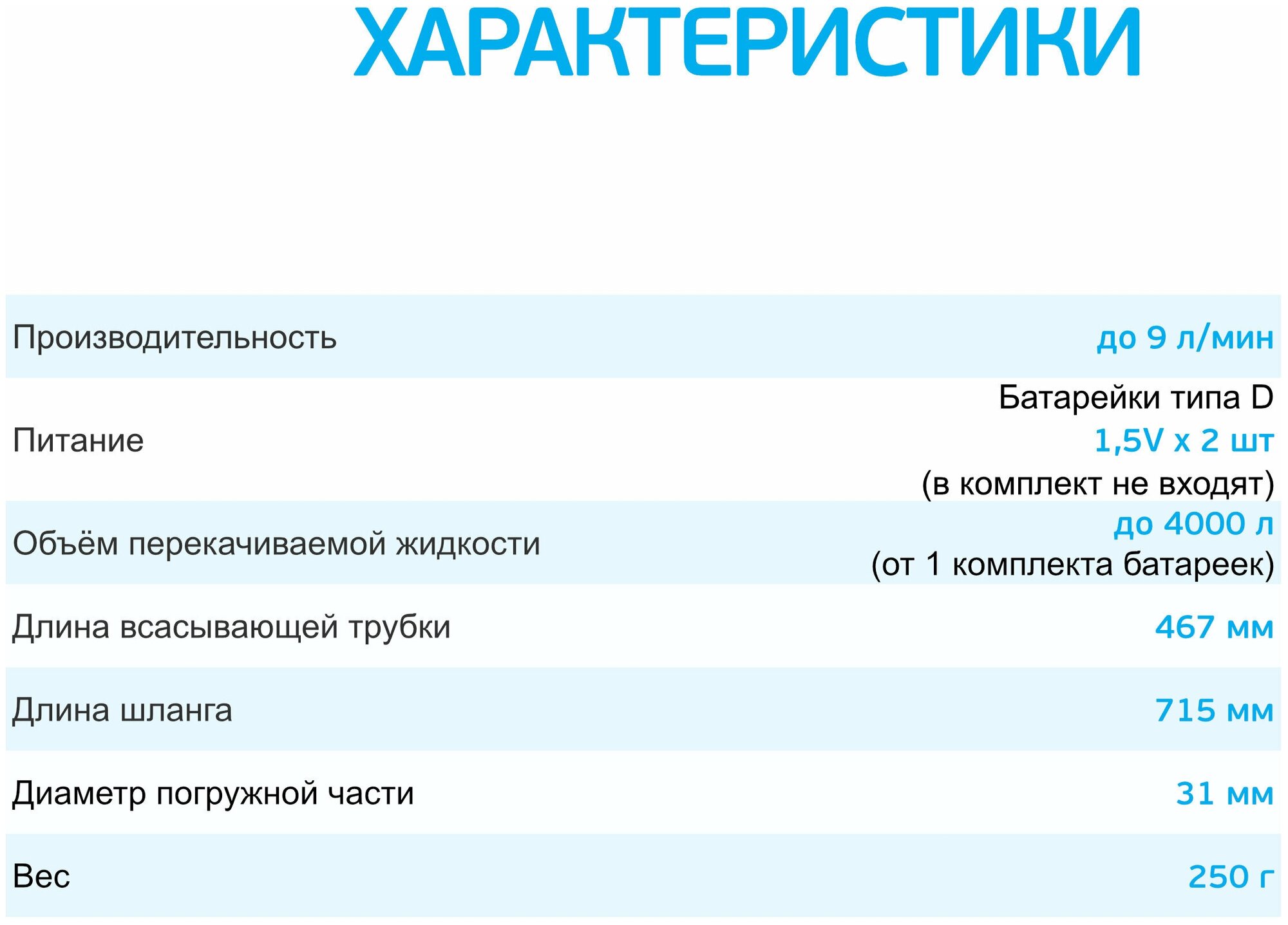 Not suitable for motor oils; productivity: up to 9 l / min, power supply: batteries type D 1.5V x 2 pcs are not included; volume of pumped liquid: up to 4000 l from 1 set of batteries; suction tube length: 467 mm, length