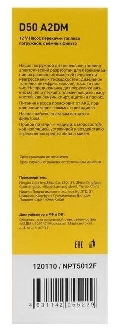 Submersible fuel transfer pump, 12V, D50, removable filter, capacity 40 l/min