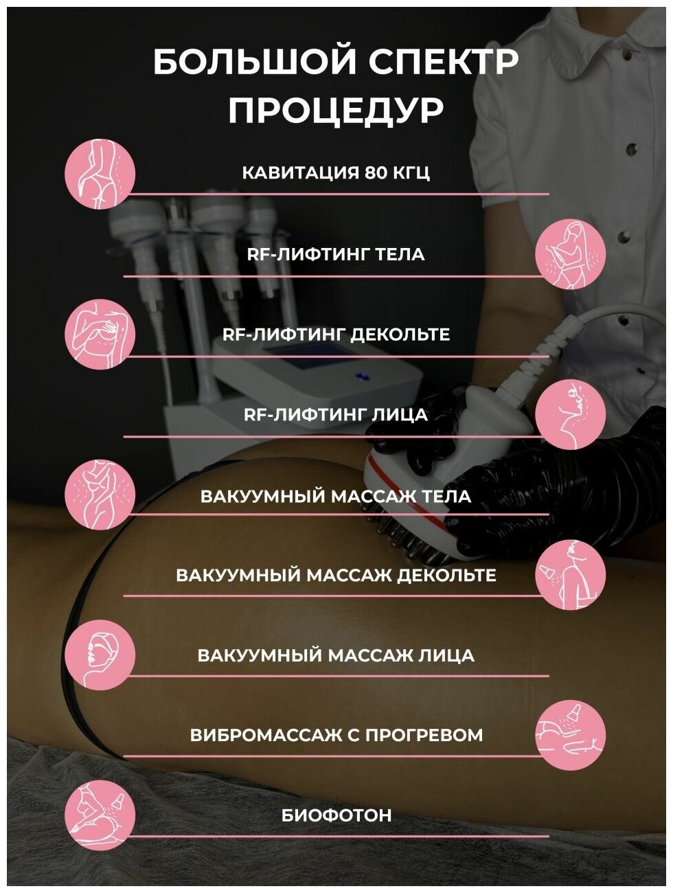 Exposure: vacuum, radio waves, mechanical, ultrasound, vibration, procedure type: lifting, lymphatic drainage, cavitation, massage, scope: body, face, number of functions: 5 pcs., installation type: floor, features: