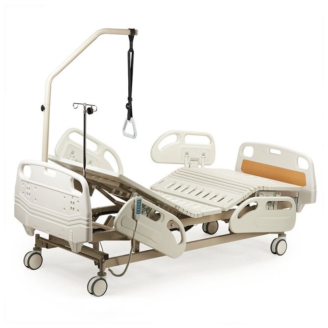 Product type: medical furniture, material: ABS plastic, steel, features: infusion stand, rotating wheels, locking brakes, pull-up stand, electric drive, folding side rails, adjustable height