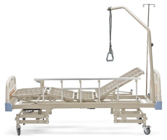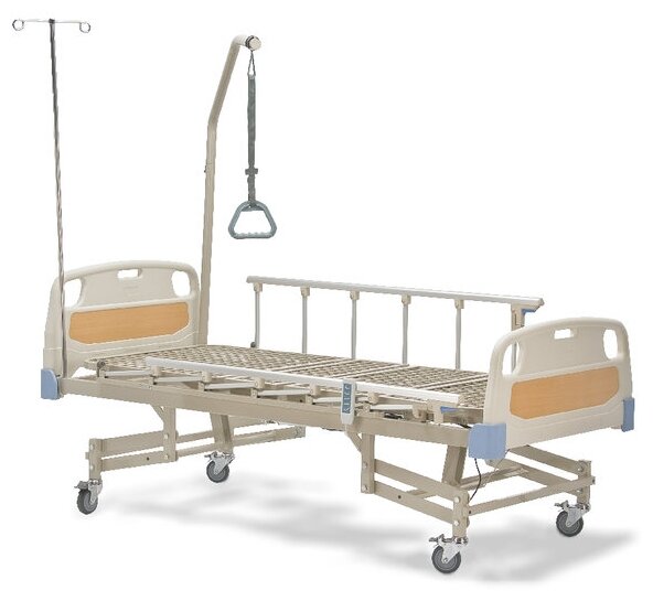 Product type: medical furniture, material: ABS plastic, steel, features: infusion stand, rotating wheels, locking brakes, pull-up stand, electric drive, folding side rails, adjustable height