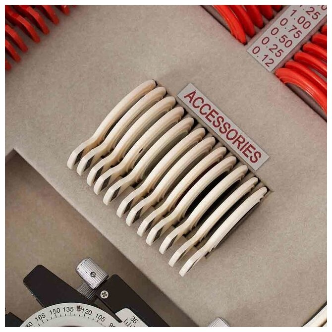 Gradation of spherical lenses +: from 0.12 to 20.0 diopters; gradation of spherical lenses -: from 0.12 to 20.0 diopters; gradation of cylindrical lenses +: from 0.12 to 6.00 diopters; gradation of cylindrical lenses -: from 0.12 to 6.00 diopters; gradati