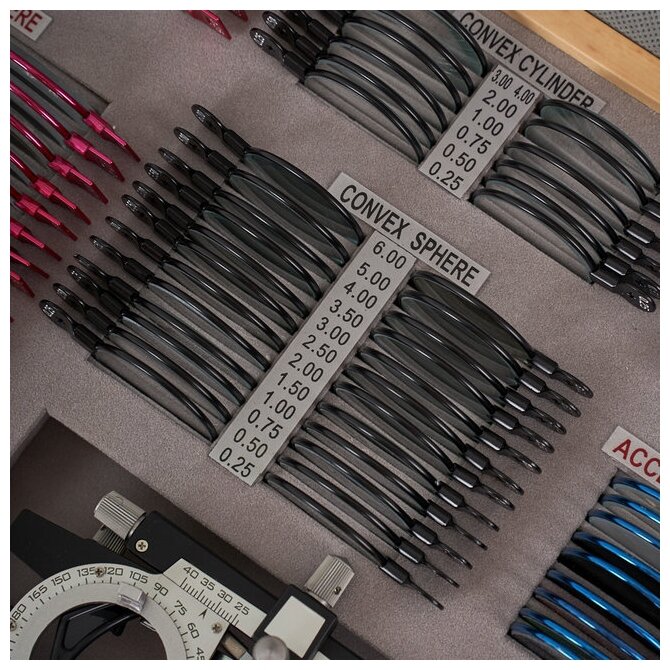 Spherical lens graduation +: 0.25 to 6.0 diopters, spherical lens graduation -: 0.25 to 14.0 diopters, cylindrical lens graduation +: 0.25 to 4.0 diopters, cylindrical lens graduation -: 0.25 to 4.0 diopters, spectacle prism graduation: 0, 5; 1.0; 2