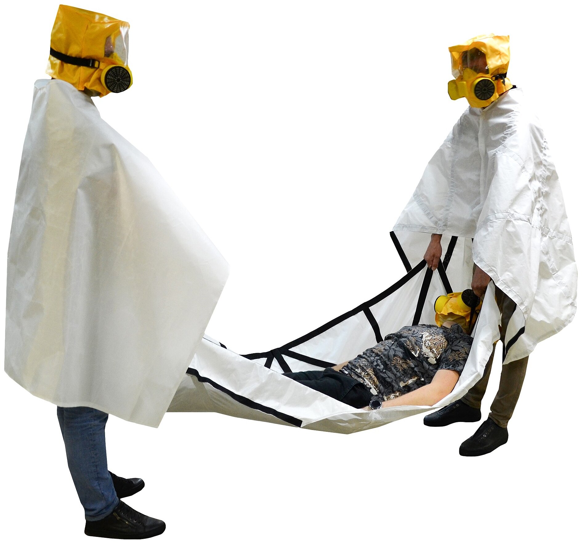 Material: water-, fire-resistant fiberglass; 6 carrying handles, special reinforcing elements; the weight of the carried person is up to 140 kg; resistant to repeated disinfection; folded dimensions: 18x13x9 cm