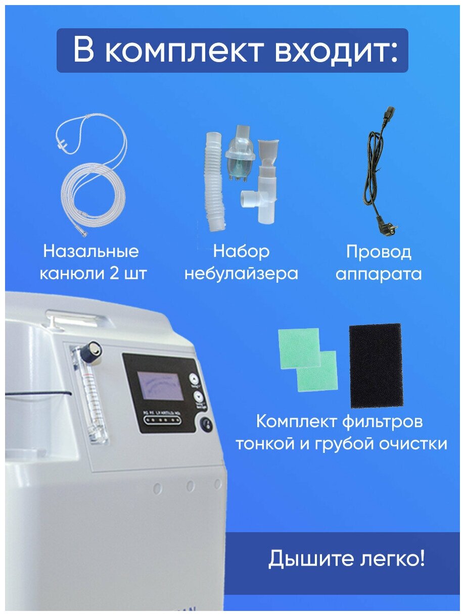 Oxygen productivity 0.5 - 5 l/min; maximum oxygen concentration 93%; country of origin China; noise level ≤ 35 dB; electrical power consumption 350 W; overall dimensions 348 x 280 x 505 mm; maximum comp