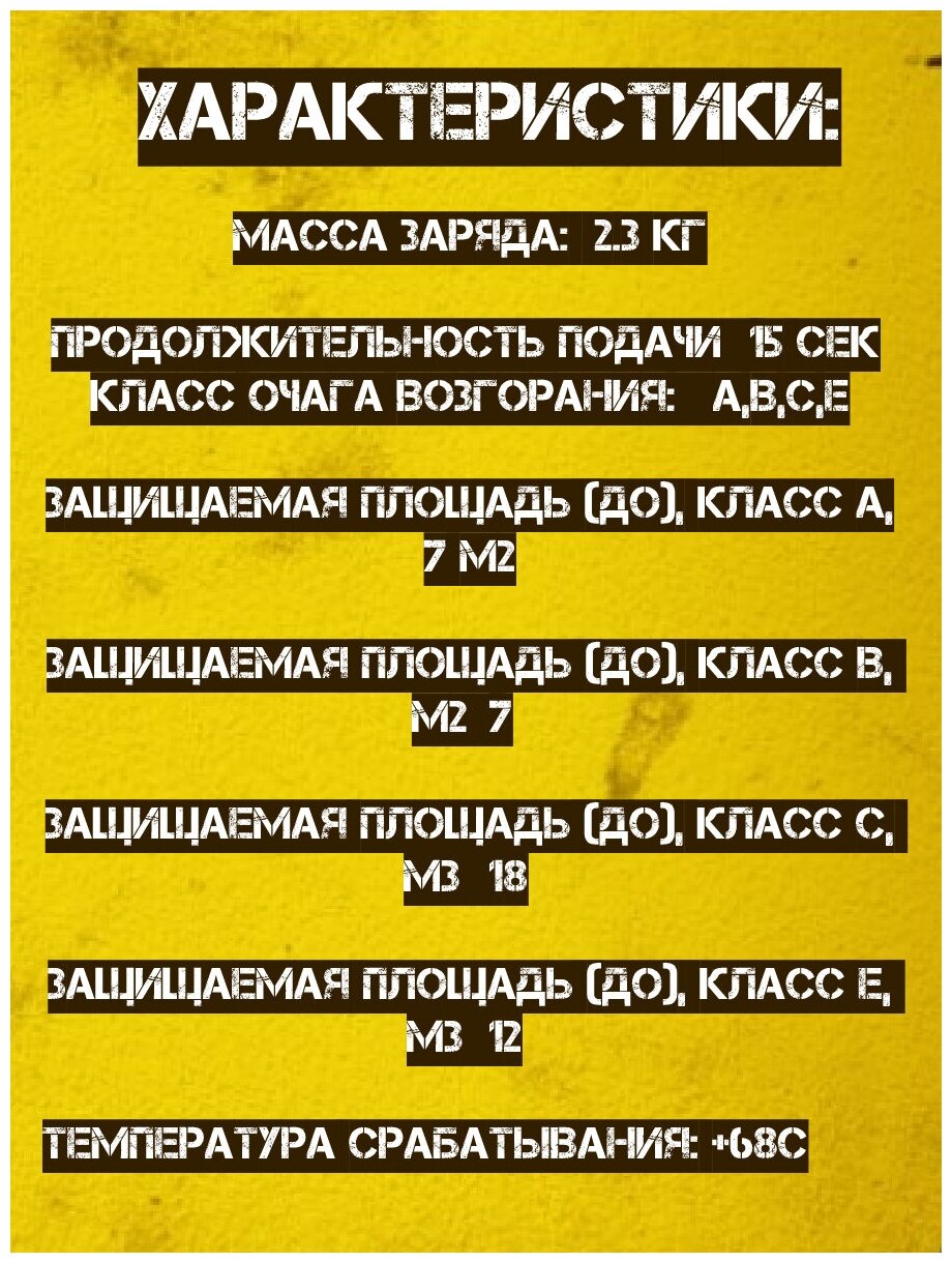 Extinguishing agent type: powder, pressure indicator, actuation method: automatic, fire class: A, E, C, B, charge weight: 2.50 kg, fire extinguisher weight: 3 kg, extinguishing area: 18 m², jet length: 4 m, Duration