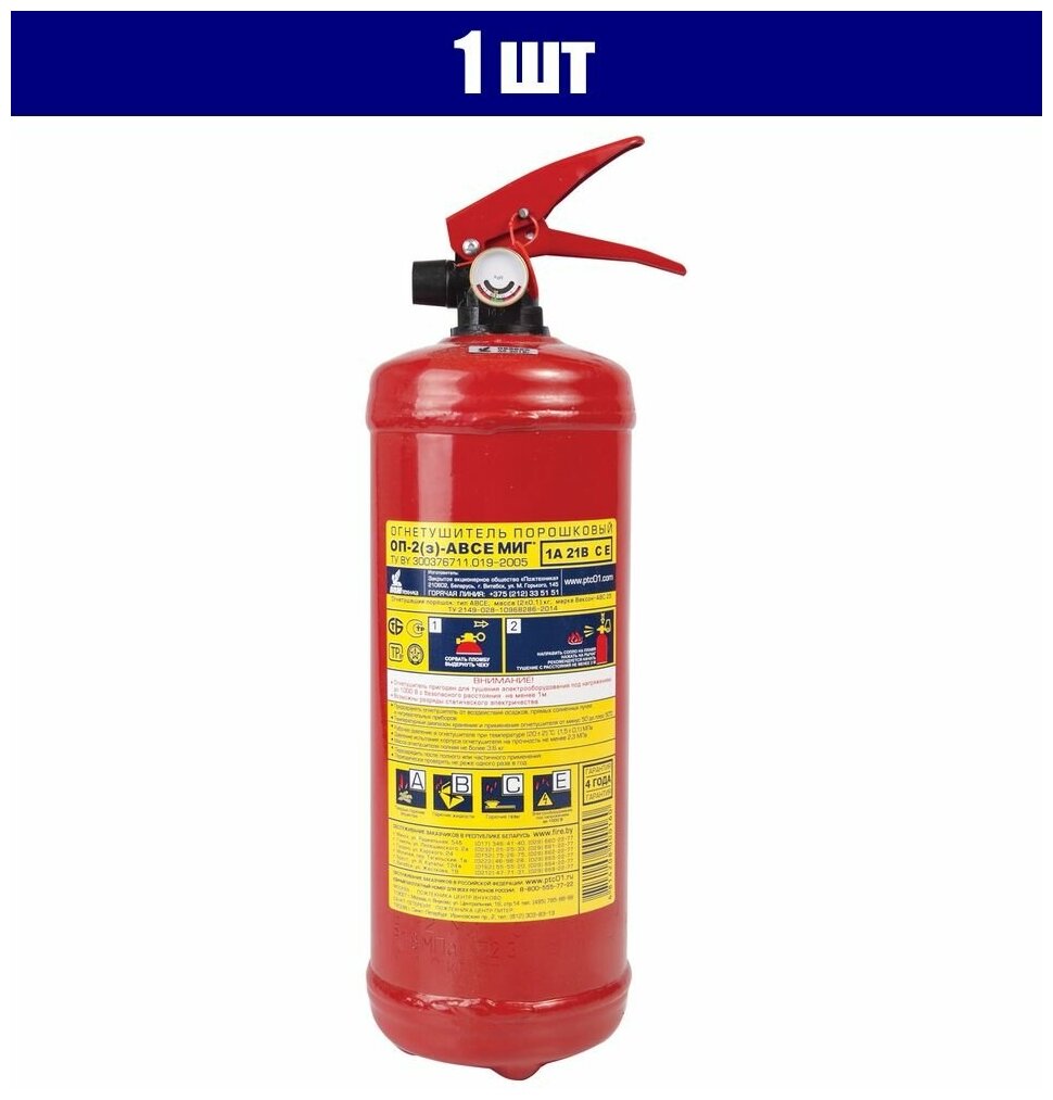 Type of extinguishing agent: powder, automobile, pressure indicator, actuation method: manual, fire class: A, E, C, B, charge weight: 2 kg, jet length: 2 m, Extinguishing agent delivery time: 6 s, height: 405 mm , width: 120 mm