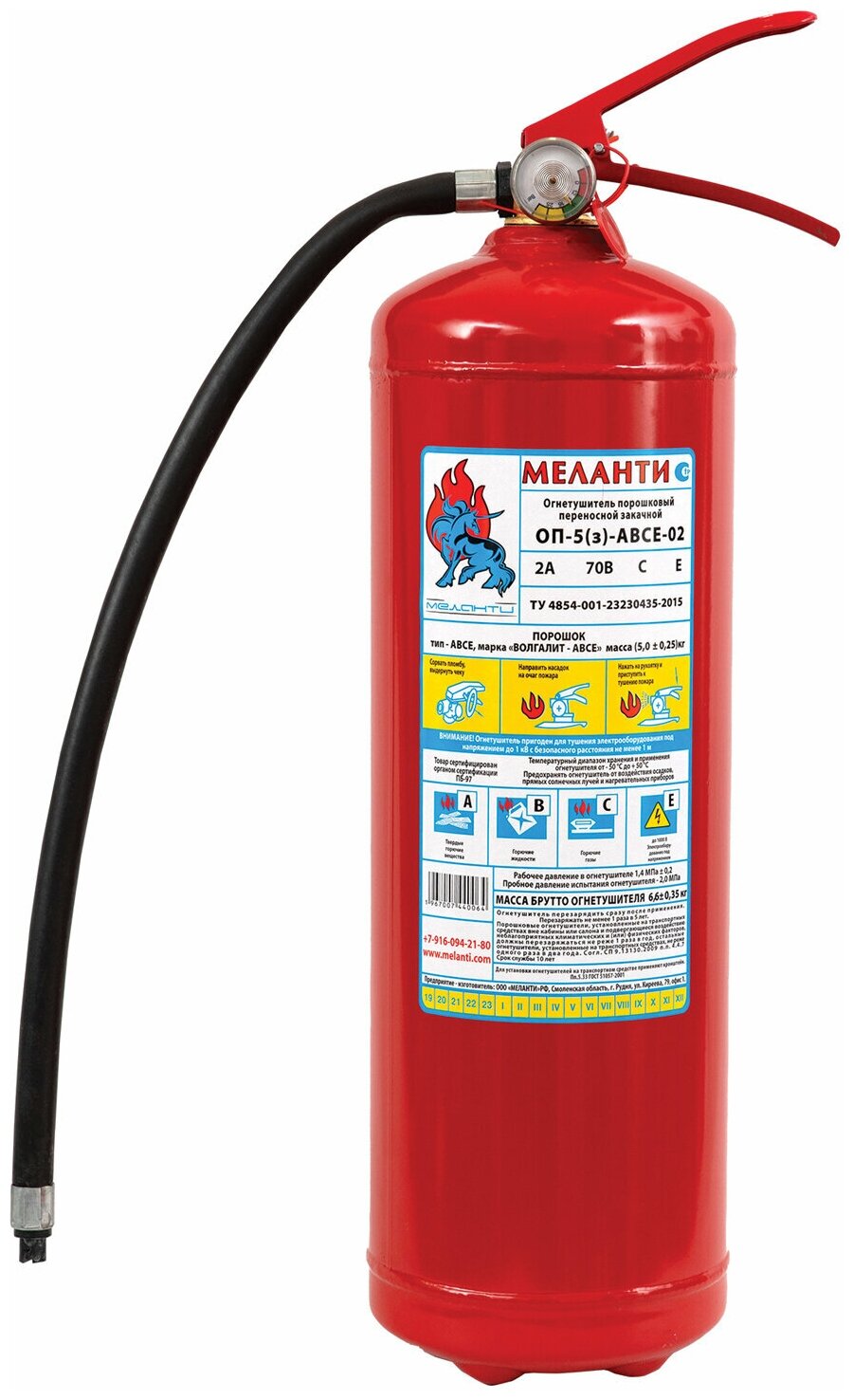 Extinguishing agent type: powder, fire class: C, charge weight: 5 kg, fire extinguisher weight: 7.80 kg, jet length: 3 m, Extinguishing agent delivery time: 10 s