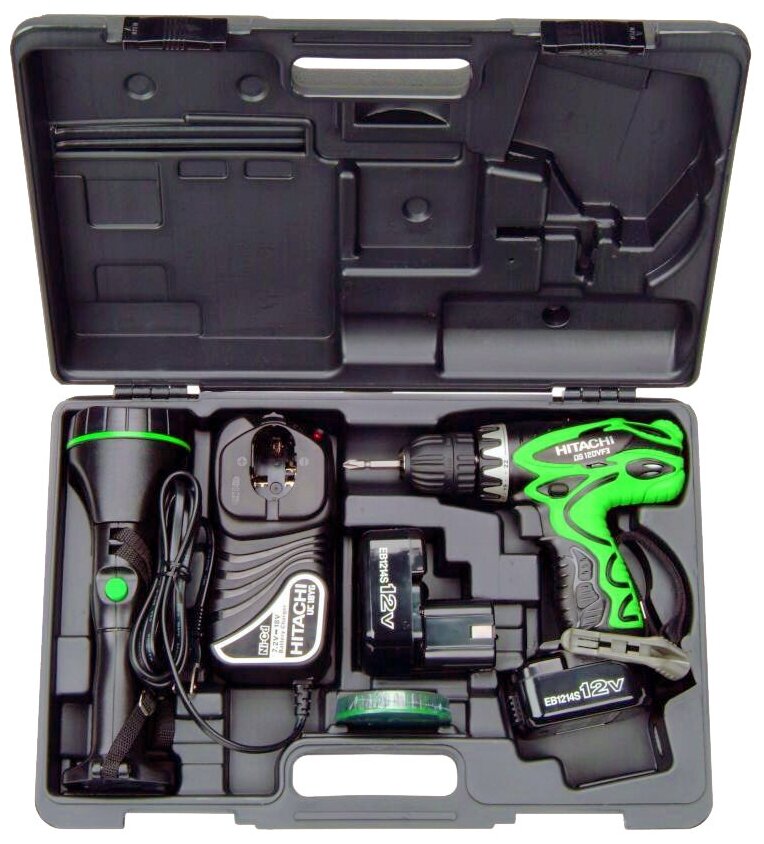 Two batteries, charger, flashlight, bit set, case