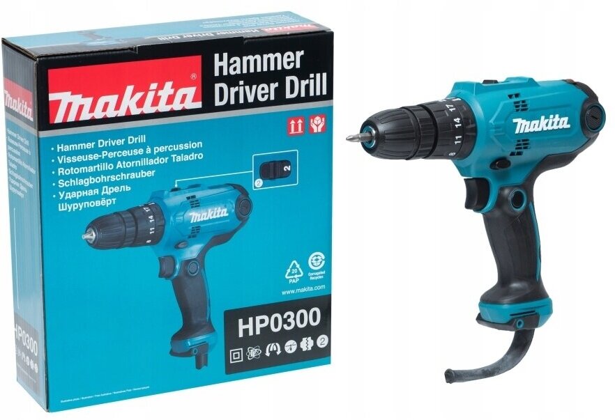 Power supply: from the mains, maximum torque: 56 Nm, impact, power consumption: 320 W, chuck type: keyless, max. drilling diameter metal: 10 mm, max. drilling diameter wood: 28 mm, design features