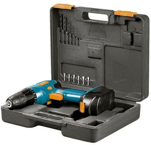 Two batteries, charger, set of drills and bits, case