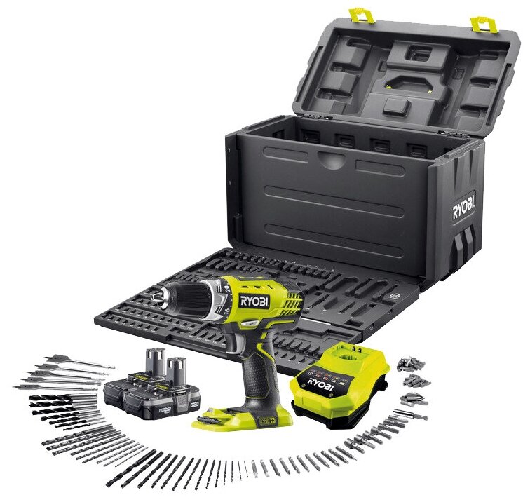 Two batteries, charger, set of drills and bits 100 pcs., case