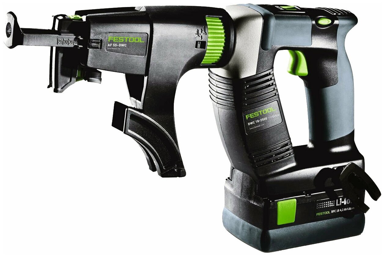 Two batteries, charger, magazine attachment, depth gauge, magnetic bit holder, 2 bits, belt clip, hook, case