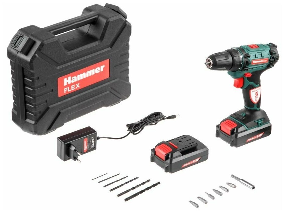 Drill driver, rechargeable batteries - 2 pcs, charger, set of bits, set of drills, case