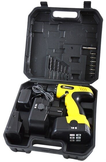 Two batteries, charger, set of drills and bits, case